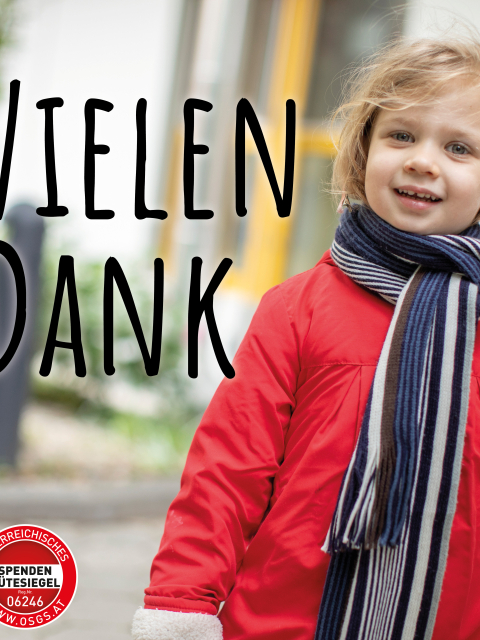 Ein Mädchen mit roter Jacke und blau-grau gestreiftem Schal lächelt in die Kamera. Am Bild ist der Schriftzug Vielen Dank zu lesen.